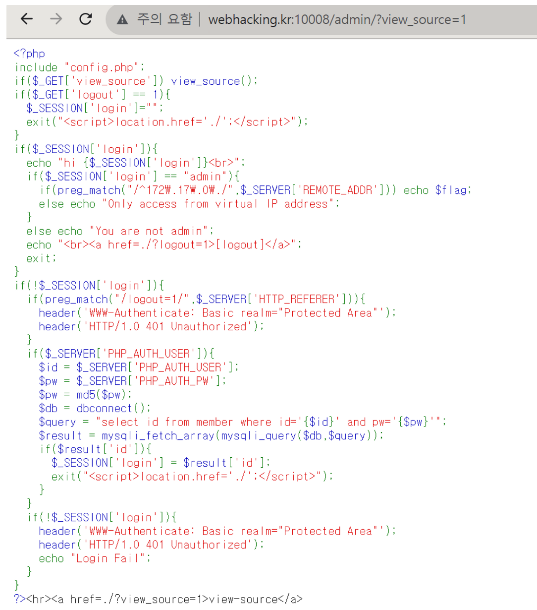 $_SESSION['login'] == "admin" 이고 preg_match("/^172\.17\.0\./",$_SERVER['REMOTE_ADDR']) 여야 플래그를 얻을 수 있다.
