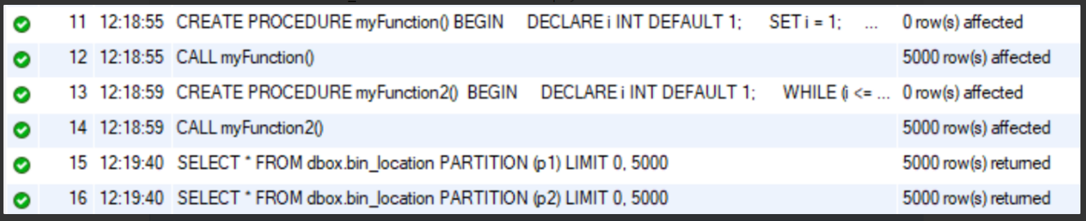 혹시나해서 테이블을 조회했더니 50만개 행 생성을 시도했던 하나의 프로시저에서 5만4천여개의 행만 만들어지고 연결이 끊어진 것으로 확인되었다..100만 개 이상 데이터는 회사 가서 경험하자 ^^